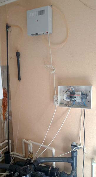 Озонатор размещается на стене, автоматическое управление Установки включает насос и озонатор только при включённой системе фильтрации бассейна.